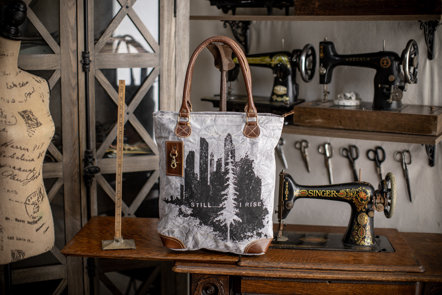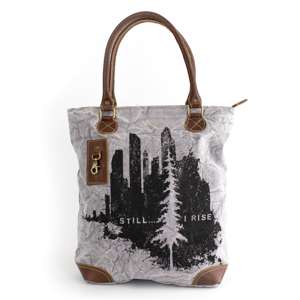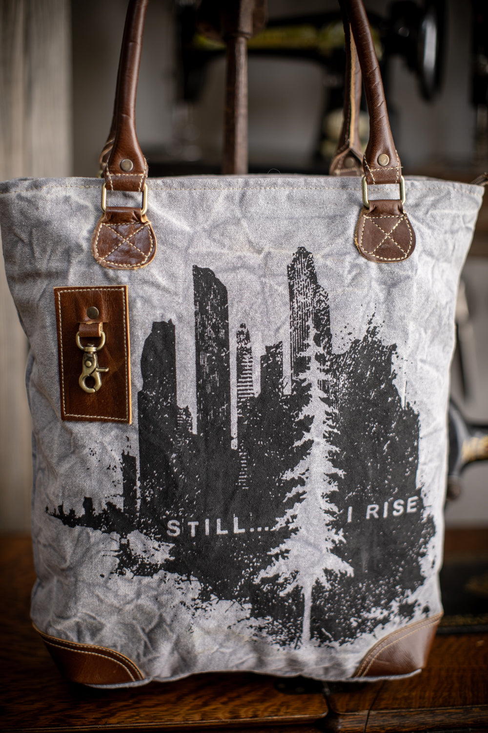 The Still I Rise Recycled Canvas Tote is the ultimate blend of durability and style, perfect for everyday use or special outings. Crafted from heavy-duty recycled canvas, genuine leather trim, and brass hardware, this tote bag is designed for those who appreciate both functionality and ethical fashion.