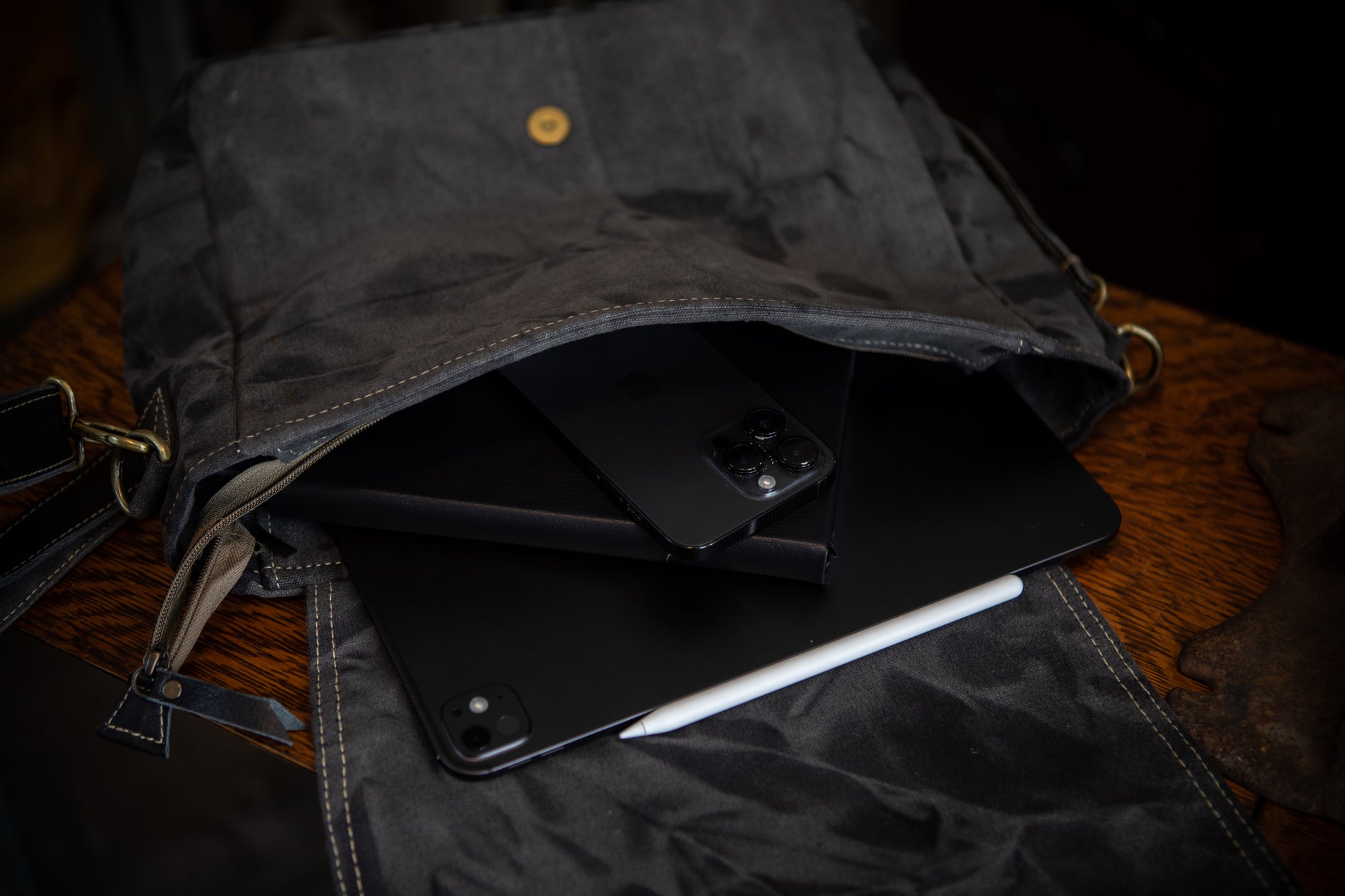 - Zippered top closure for secure storage, plus magnetic snap flap